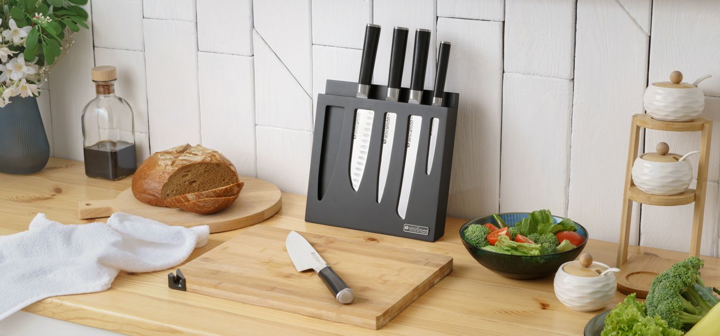 Кстати, различные виды подставок для ножей также можно приобрести и отдельно. Выбор их достаточно велик и включает в себя также универсальные настольные подставки для ножей и настенные магнитные планки для ножей.